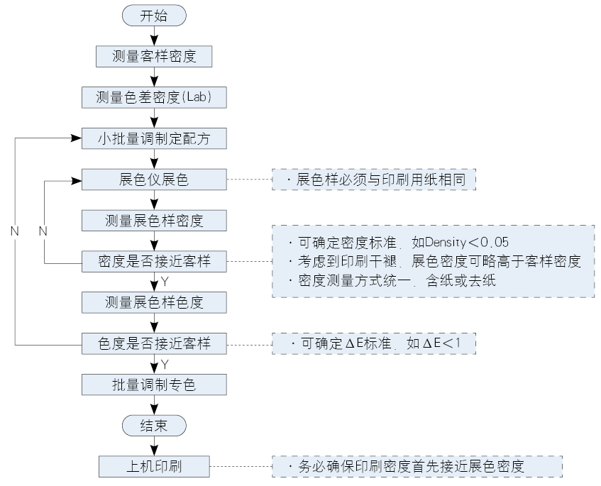 為便于實(shí)際操作,我們也對(duì)整個(gè)專色自制的流程和細(xì)節(jié)總結(jié)了如下作業(yè)步驟,并繪制了作業(yè)流程圖(如圖3)。