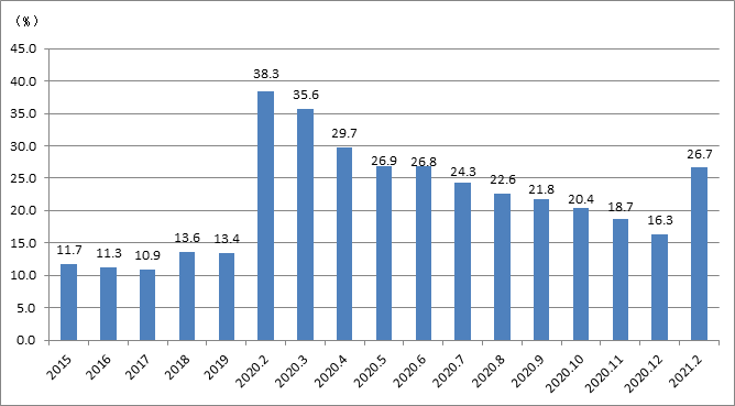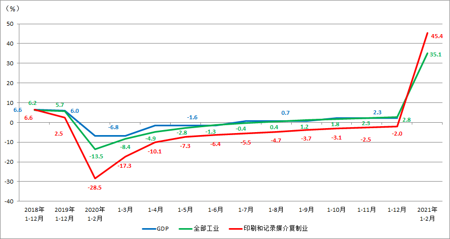 2021年1-2月,全部工業(yè)(規(guī)模以上企業(yè))工業(yè)增加值同比增長35.1%,而“印刷和記錄媒介復制業(yè)”工業(yè)增加值同比增長45.4%。同比大幅增長,是經(jīng)濟因素、政策因素和基數(shù)效應共同作用的結(jié)果。尤其去年1-2月,疫情突起,全國經(jīng)濟按下暫停鍵,增加值基數(shù)跌落較深,從而顯著抬高了今年1-2月的同比增速。