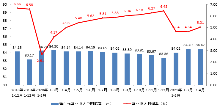2021年1-4月,印刷業每百元營業收入中的成本為84.47元,與上月持平。此項指標高于全部工業83.48元的平均水平。
