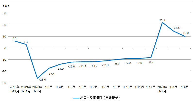 2021年1-4月,印刷業出口交貨值同比增長10%。與全部工業27.3%的出口增長率相比,印刷業的出口增長恢復較慢。4月份,印刷業出口交貨值同比增長1%,增勢偏弱。