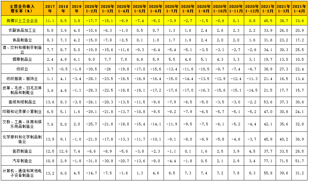 表中顯示,2021年1-4月全部工業主營業務收入平均增長33.6%,生產增勢依然較好。