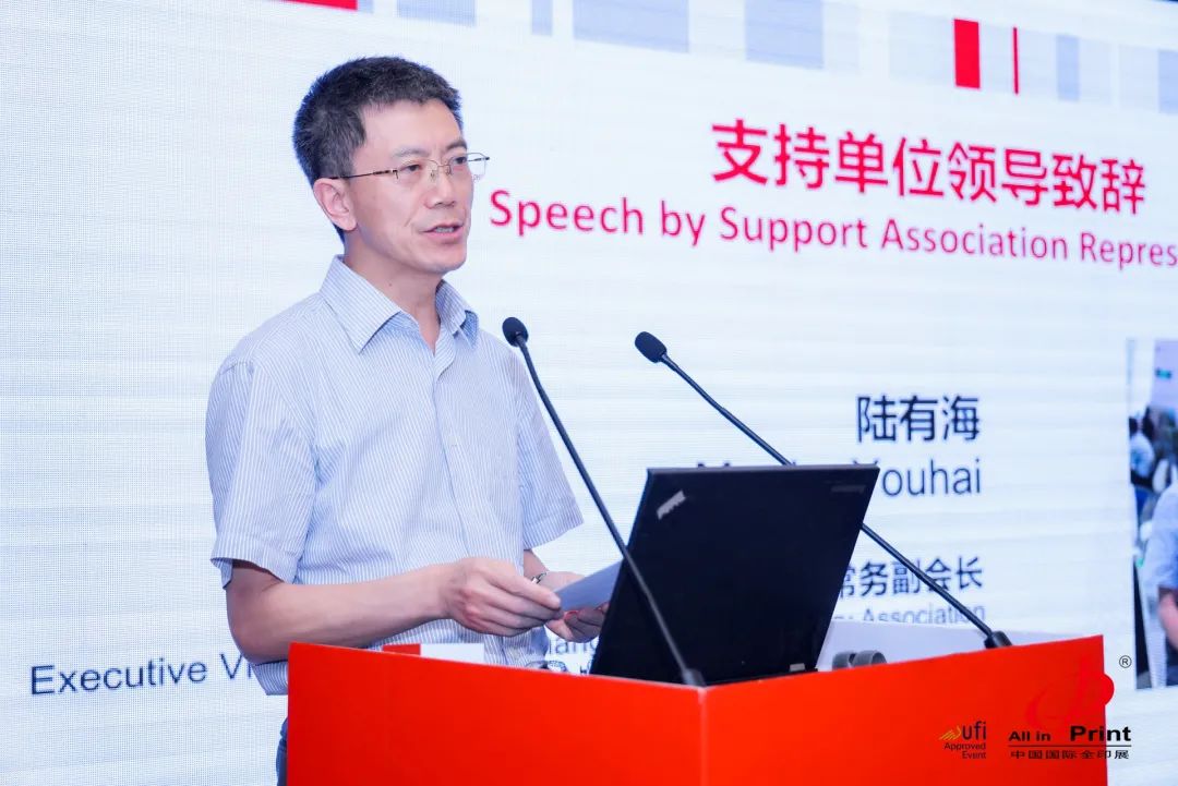 自創辦至今,全印展一直植根上海,輻射全球。上海市印刷行業協會常務副會長陸有海先生代表協辦單位致辭,他表示上海市印刷行業協會將一如既往地充分發揮協會作用,團結和聯合各方面的力量,在展會籌辦、觀眾參觀、論壇聽眾組織等各方面面給予全力支持。