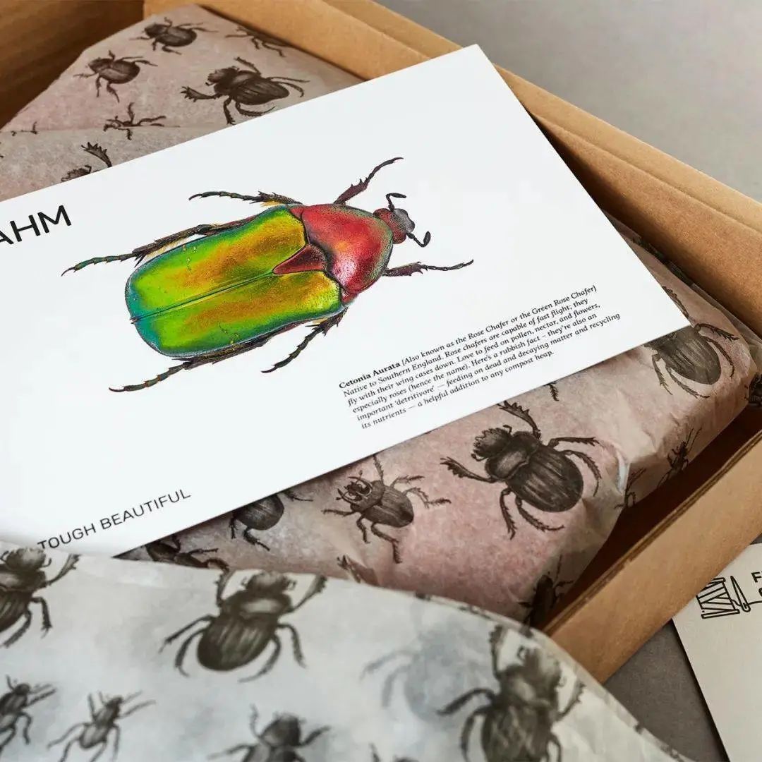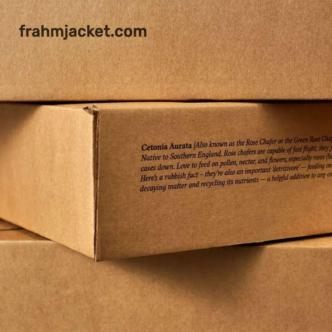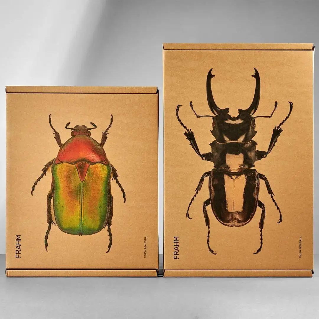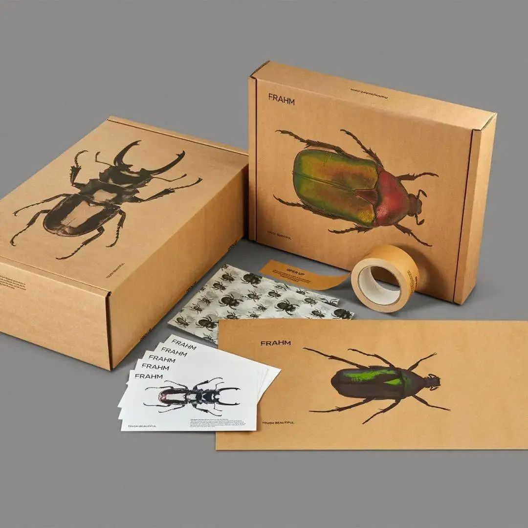 FRAHM 要求Supple Studio 為他們的夾克創造環保且令人難忘的包裝——這是為了加強他們品牌對于環境以及品質的信念與堅持。Supple Studio采用英國本土甲蟲的微距照片--大自然堅韌而美麗的小動物作為主角,在盒子和袋子上大規模印刷,甲蟲的想法巧妙地反映了 FRAHM 服裝適合在各種天氣下外出的機能。