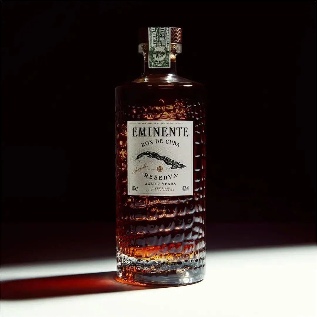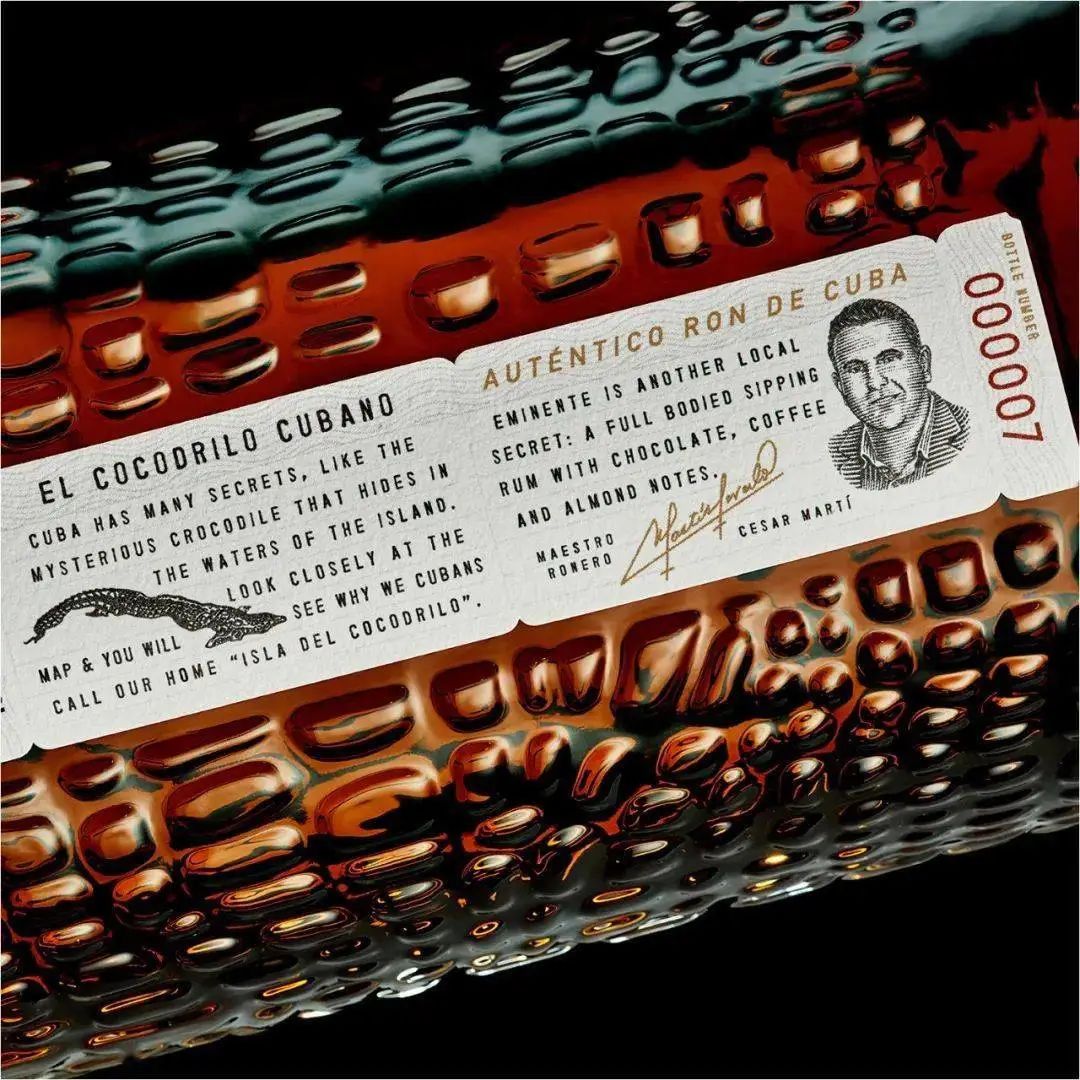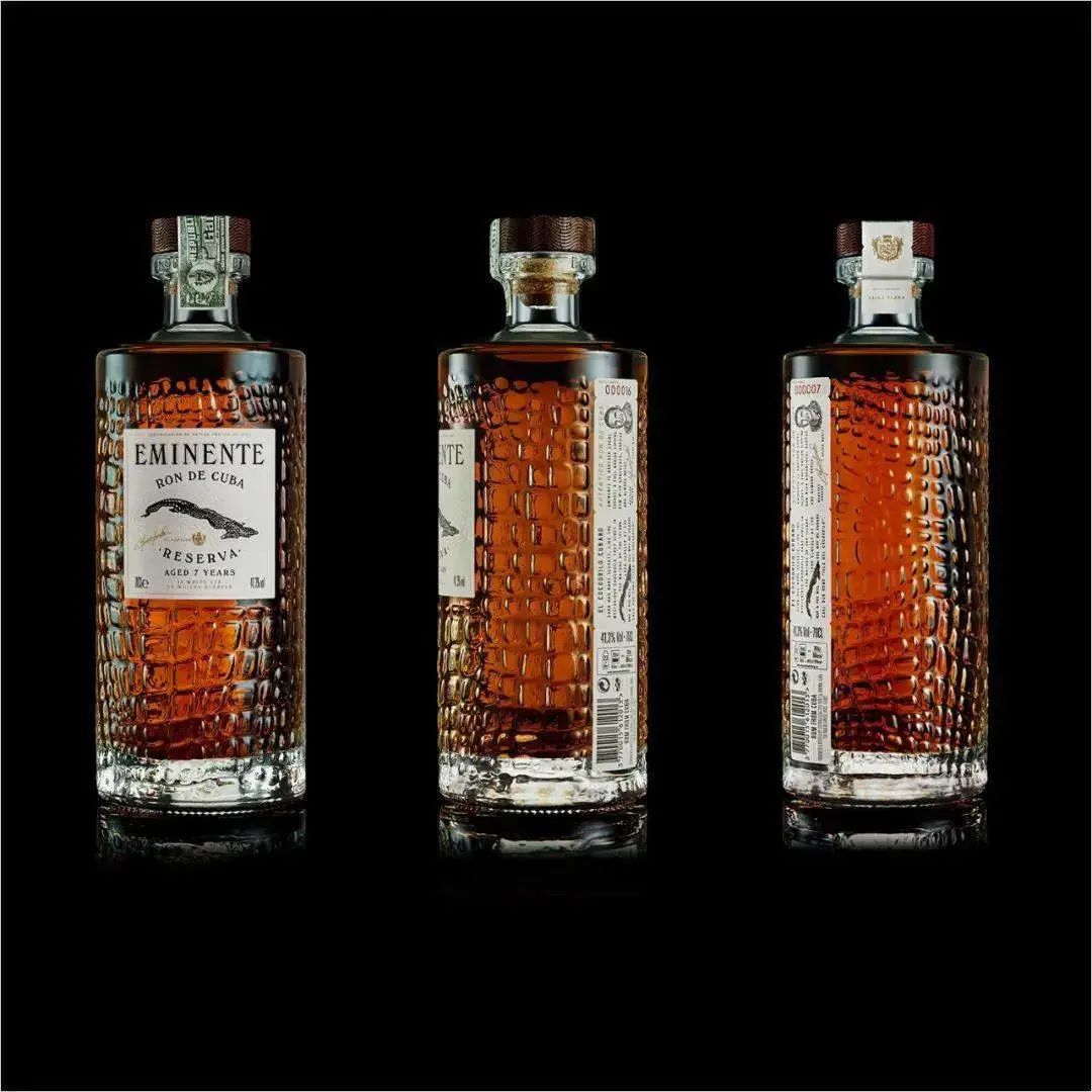 Eminente Reserva 這款朗姆酒帶有鱷魚形標志和帶紋理的玻璃瓶,其靈感來自古巴本土當地人稱之為“Isla del Cocodrilo”(鱷魚島)的朗姆酒。這款平肩玻璃酒瓶具有復雜的浮雕紋理和銘文“Elaborado en Cuba del campo a la botella”(從田地到瓶子都在古巴制作),從無到有的制作,是一項精雕細琢的工藝。