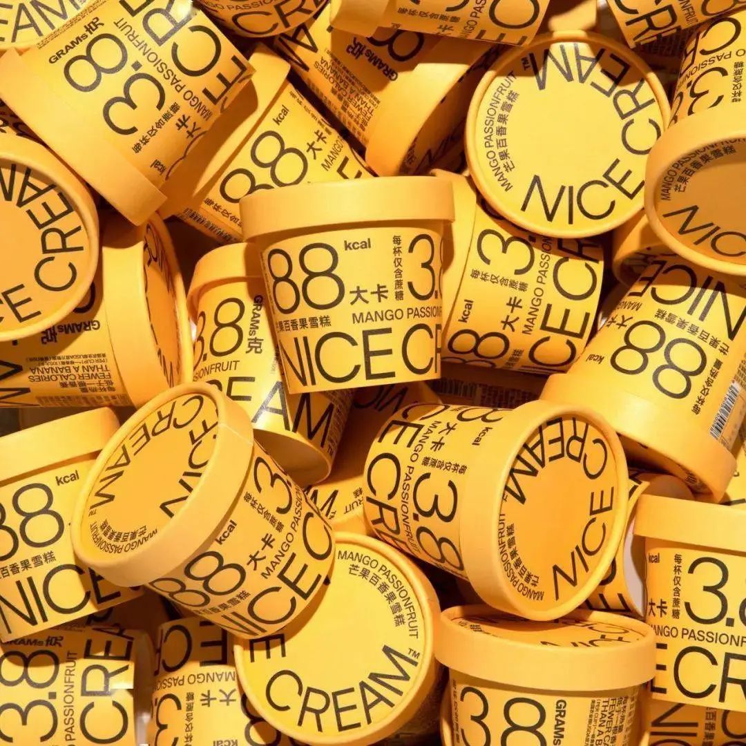 NICE CREAM是一個新興的冰淇淋品牌,成立于2018年,主打低卡健康的產品理念。Han Gao為其冰淇淋產品設計的視覺標識和包裝,采用馬卡龍配色,同時以黑色文字直接將卡路里、糖和脂肪的含量呈現于外觀之上,傳達了產品的主要賣點——低糖、低熱量。不同于大多數采用食品圖片作為主視覺元素的冰淇淋包裝,該系列產品以不同大小的數字、中英文字體營造出更具層次感的信息,加之豐富、飽和的色彩,讓整體設計充滿活力。