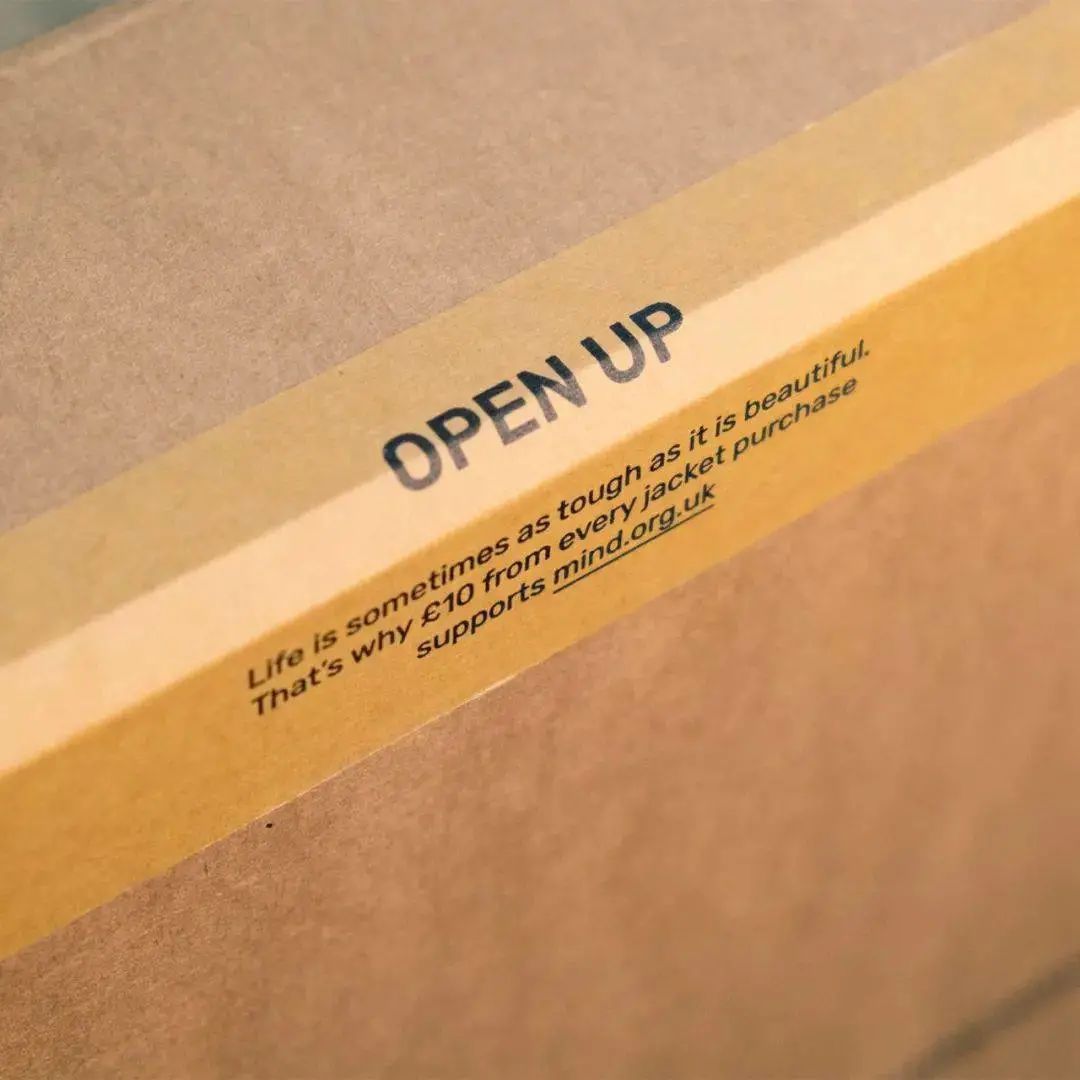 在包裹封口的膠帶上印上的"Open Up"的定制信息,并提醒收件人 FRAHM 支持 Mind--并且鼓勵大家開放心態 Open Up 不需為了談論自己的心理狀態與健康感到尷尬。