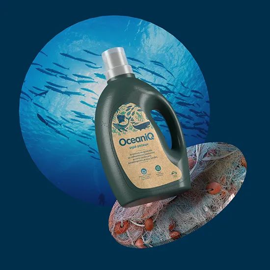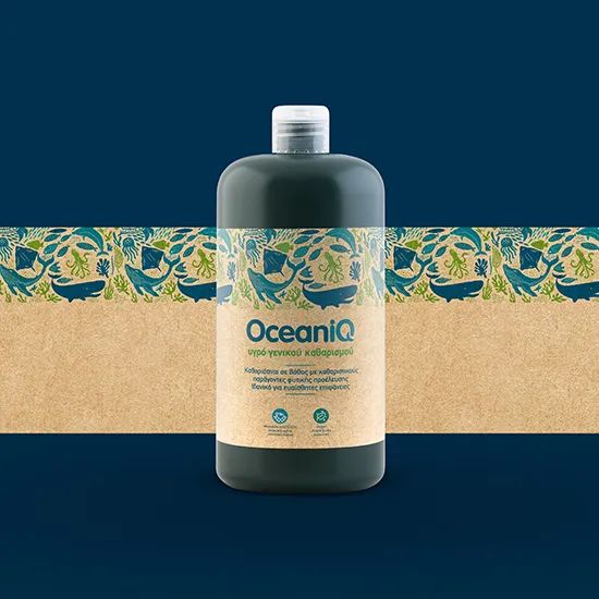 OceaniQ是專供于希臘連鎖超市Alpha Beta的純素家庭護理洗滌劑品牌,其名稱由“Oceanic”(海洋的)和“IQ”組合而成,寓意了塑料海洋垃圾在其包裝中的巧妙使用。OceaniQ的產品均以溫和清潔的植物性試劑制成,為了吸引更多具有環保意識的消費者,品牌邀請雅典的設計公司2Yolk為其打造了全新可持續包裝,由100%海洋回收漁網制成,減少了碳足跡的產生。同時包裝標簽上繪制了以保護海洋生物為主題的插圖,提醒人們環境保護的重要性。