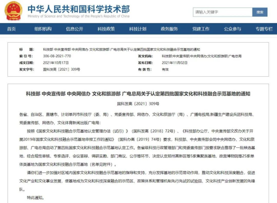 近日,國家科學技術部官網公布了《關于認定第四批國家文化和科技融合示范基地的通知》文件。