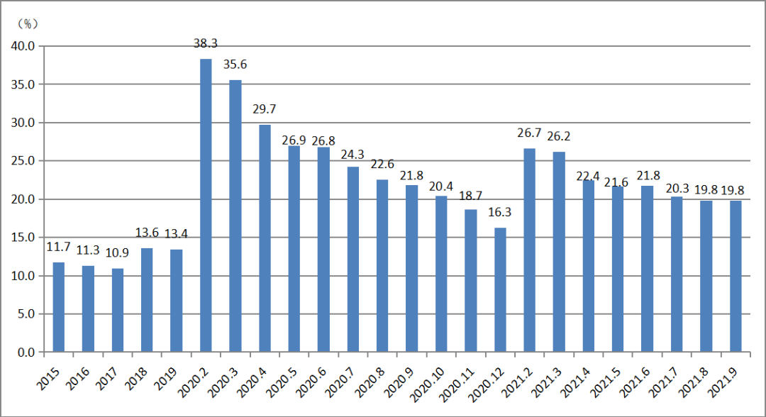 2021年9月末,印刷業(yè)規(guī)模以上企業(yè)的資產(chǎn)負(fù)債率為46.12%。相比上月46.26%的負(fù)債率,略有下降。而與9月末全部工業(yè)56.3%的資產(chǎn)負(fù)債率相比,印刷企業(yè)的負(fù)債水平整體較低。