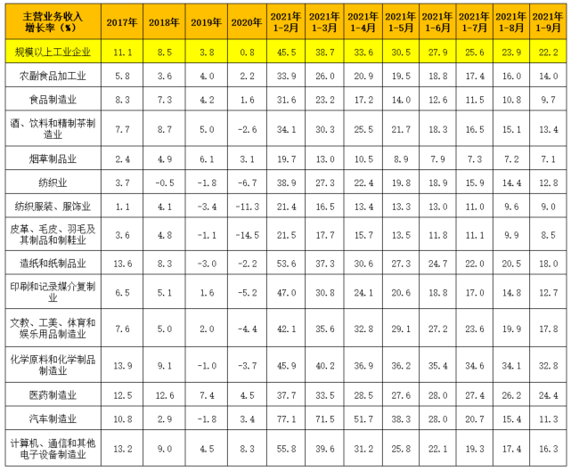 表中顯示,2021年1-9月全部工業(yè)主營(yíng)業(yè)務(wù)收入平均增長(zhǎng)22.2%,增速較上月有所下降。