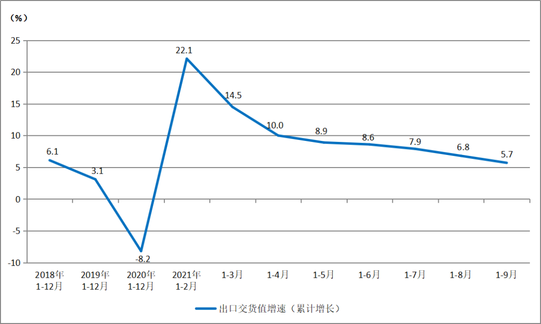 2021年1-9月,印刷業(yè)出口交貨值同比增長(zhǎng)5.7%。與全部工業(yè)19.4%的出口增長(zhǎng)率相比,印刷業(yè)的出口增長(zhǎng)恢復(fù)較慢。9月份,印刷業(yè)出口交貨值同比增長(zhǎng)1.5%,上月8.8%的較高增速并未延續(xù),波動(dòng)較大。