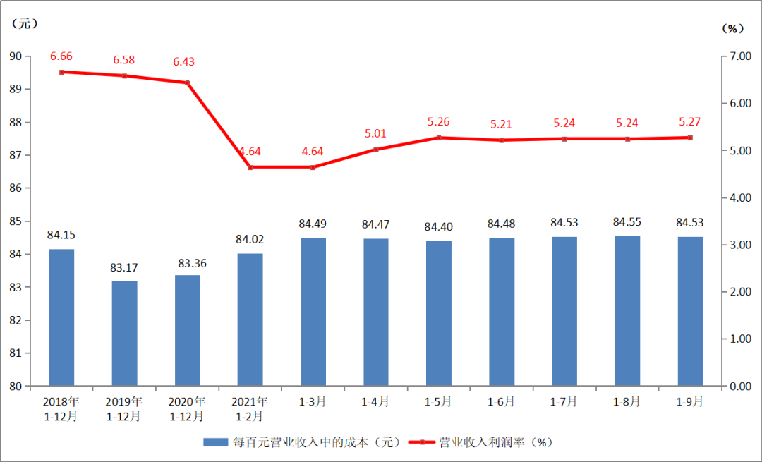 2021年1-9月,印刷業(yè)每百元營(yíng)業(yè)收入中的成本為84.53元,與前幾月數(shù)據(jù)相當(dāng)。此項(xiàng)指標(biāo)高于全部工業(yè)83.73元的平均水平。