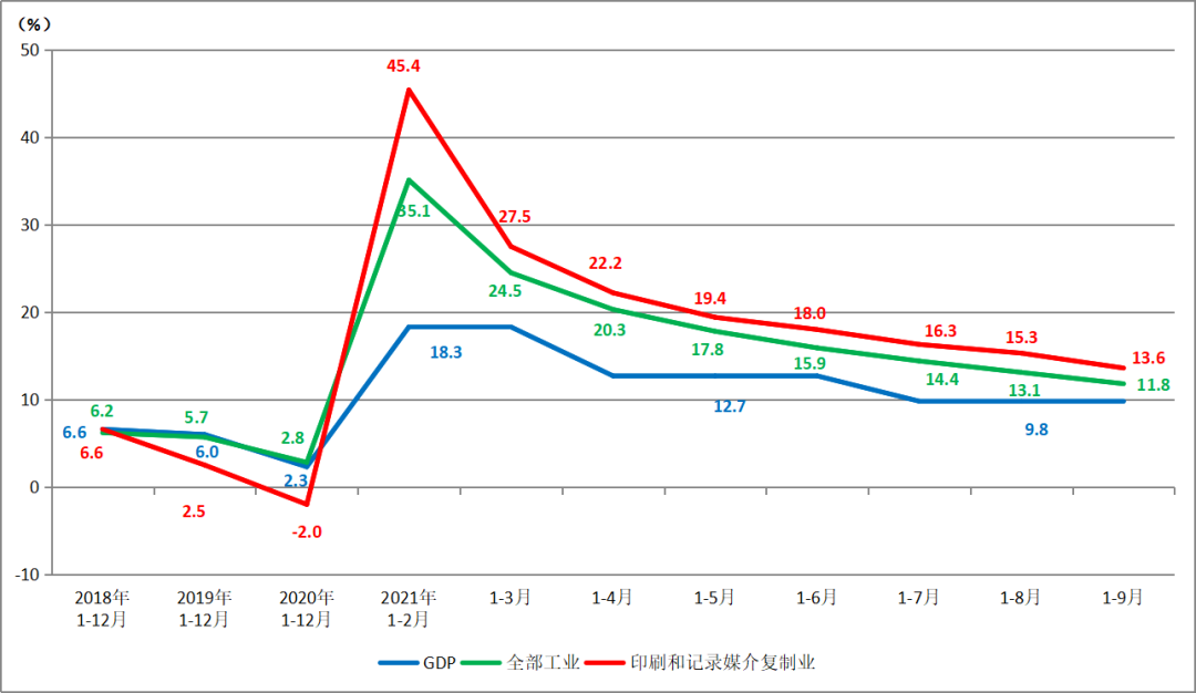 2021年1-9月,“印刷和記錄媒介復(fù)制業(yè)”工業(yè)增加值同比增長(zhǎng)13.6%,高于全部工業(yè)11.8%的平均水平。但從9月份增速來看,印刷業(yè)的工業(yè)增加值增速為3.1%,相比上月回落6.5個(gè)百分點(diǎn),為本年度各月中的最低值。