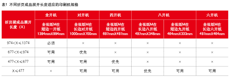 根據(jù)具體的設(shè)備狀況,前期制作時就要根據(jù)所設(shè)計的折頁成品展開長度和折頁次數(shù),確定印刷廠的印制設(shè)備能否承印。設(shè)計的折頁成品展開長度超過1010mm(上機(jī)印刷紙張寬度1020mm),就必須使用全開機(jī)印刷,無全開機(jī)的印廠無法印刷;成品展開長度超過677mm(上機(jī)印刷紙張寬度697mm),應(yīng)優(yōu)先采用對開機(jī)印刷,沒有對開機(jī)或全開機(jī)的印刷廠無法印制;成品展開長度超過477mm(上機(jī)印刷紙張寬度497mm),應(yīng)優(yōu)先采用四開機(jī)印刷,就不能選擇僅有八開機(jī)的印刷廠;成品展開長度小于477mm(上機(jī)印刷紙張寬度497mm),任何印刷廠都可印制。詳見表1。