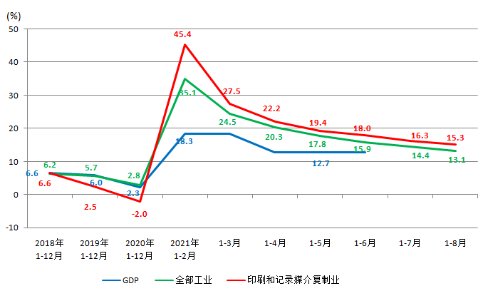 2021年1-8月,“印刷和記錄媒介復制業(yè)”工業(yè)增加值同比增長15.3%,高于全部工業(yè)13.1%的平均水平。從當月增速來看,8月份印刷業(yè)的工業(yè)增加值增速為9.6%,比7月份增加1.8個百分點,增長態(tài)勢好于全部工業(yè)平均水平。
