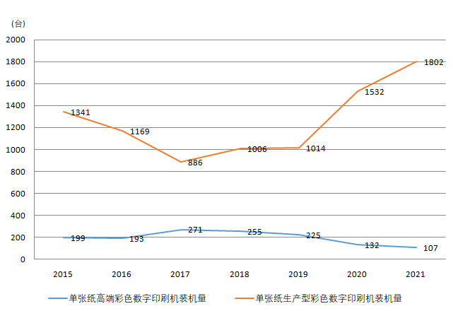 圖3 2015-2021年國內單張紙高端彩色印刷機和單張紙生產型彩色數字印刷機裝機情況(統計時間段:上年8月到當年7月)