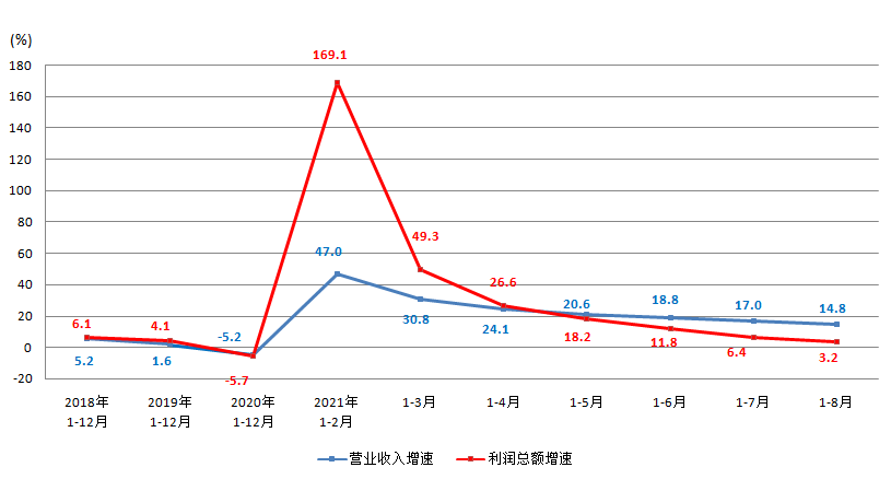 2021年1-8月,印刷業(yè)規(guī)模以上企業(yè)實現營業(yè)收入,同比增長14.8%。同時期,全部工業(yè)規(guī)模以上企業(yè)實現營業(yè)收入,同比增長23.9%。印刷業(yè)的生產銷售較去年同期持續(xù)恢復,但增速低于全國工業(yè)平均水平。