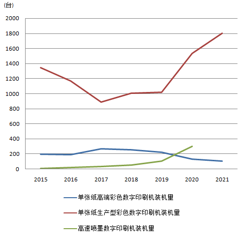 圖6 三種類型的數字印刷機的裝機匯總曲線