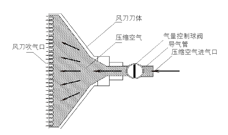壓縮空氣進入風刀后,以一面厚度僅為0.05毫米的氣流薄片高速吹出。通過科恩達效應原理及風刀特殊的幾何形狀,此薄片風幕最大可放大30~40倍的環境空氣,從而形成一面薄薄的高強度、大氣流的沖擊風幕。