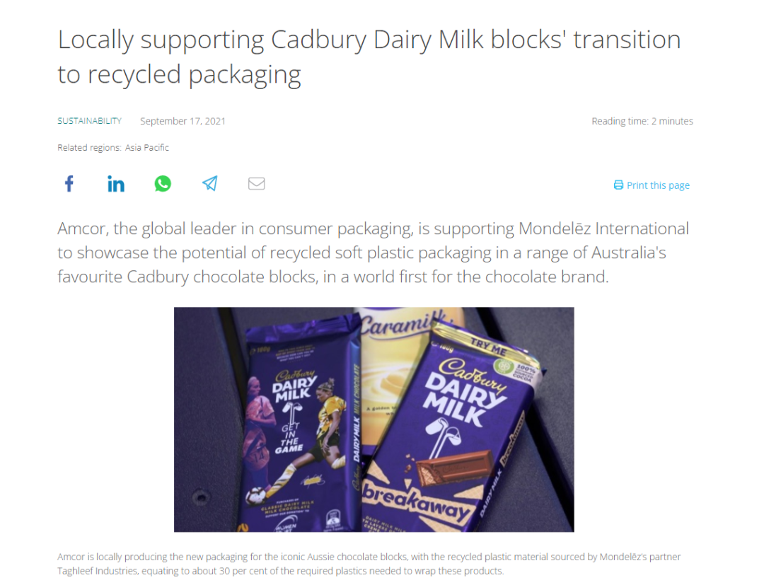 安姆科于近日宣布,將與食品巨頭億滋國際(旗下擁有奧利奧、趣多多、太平、樂之、怡口蓮、菓珍等多個品牌)合作,為澳洲市場熱賣的巧克力品牌——吉百利,打造全球首款使用軟塑包裝回收料制成的巧克力專用軟包裝,以展示化學回收塑料的市場潛力。
