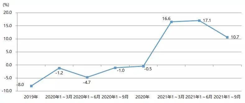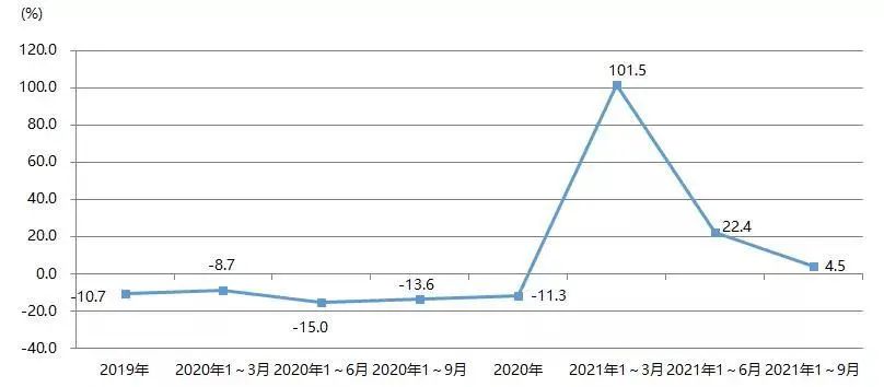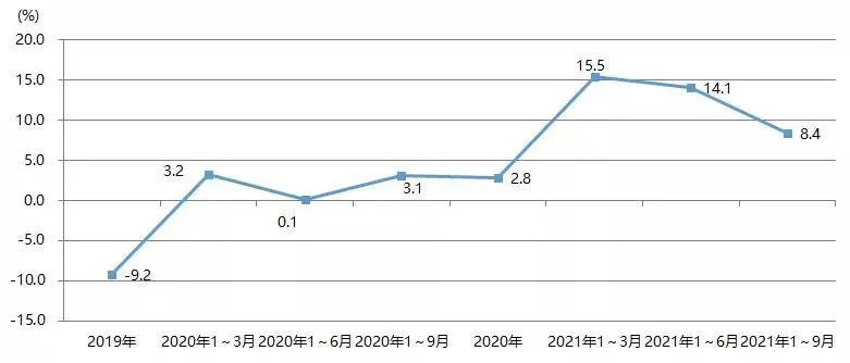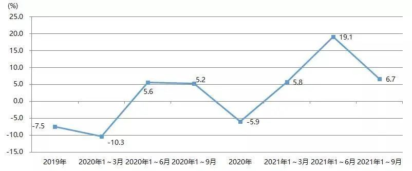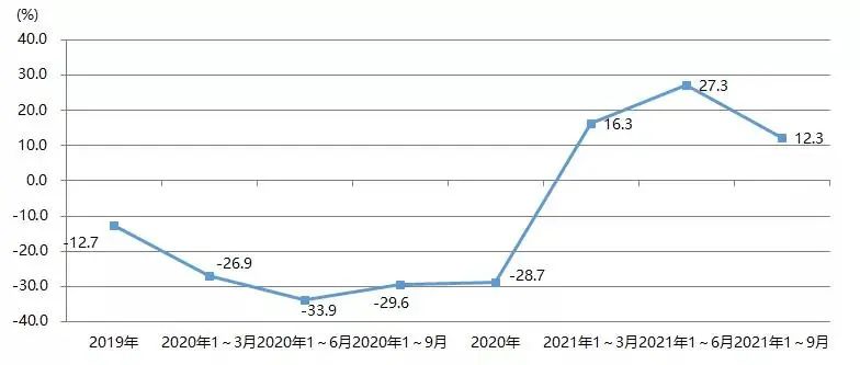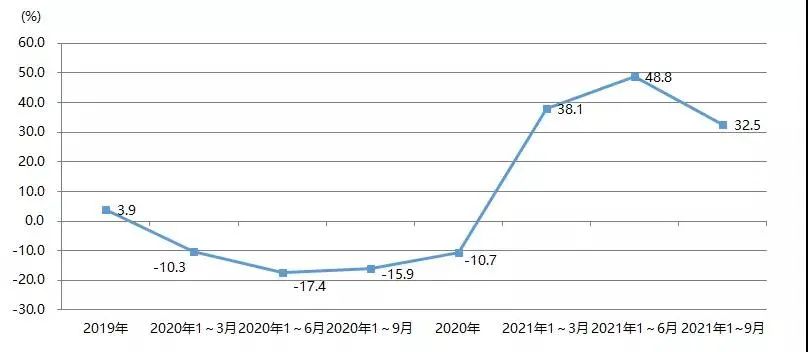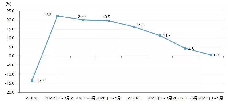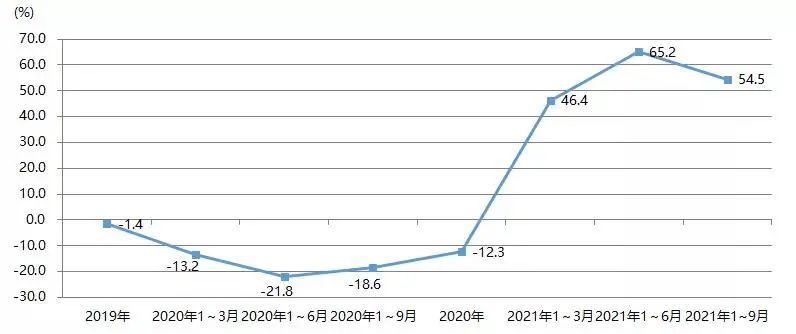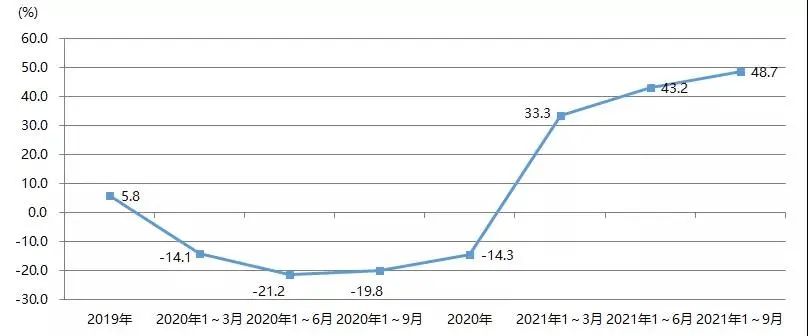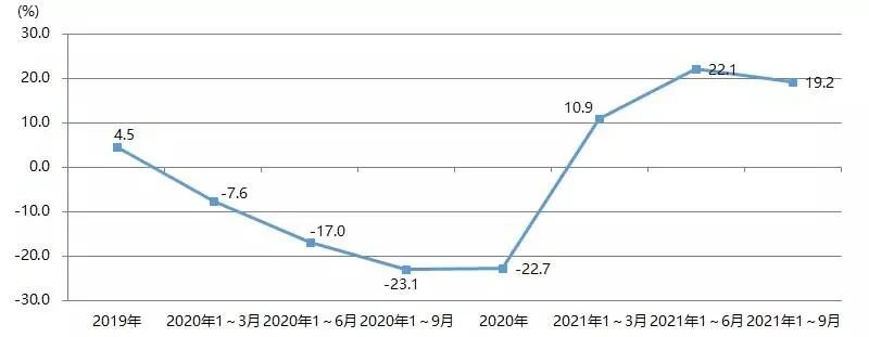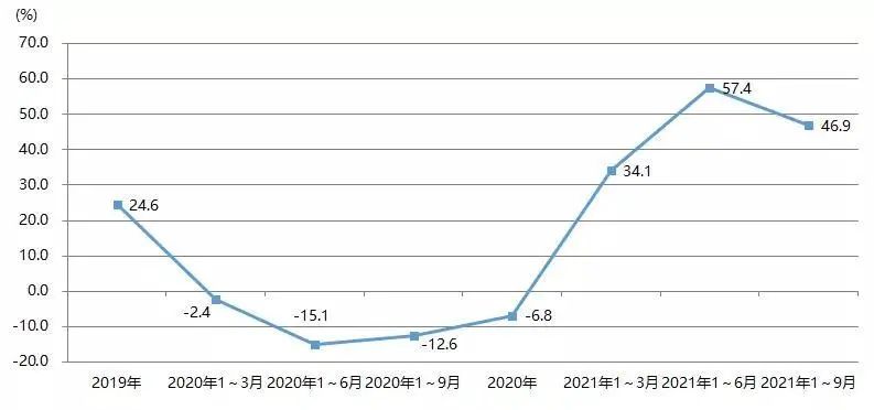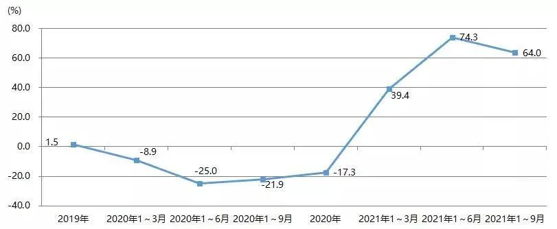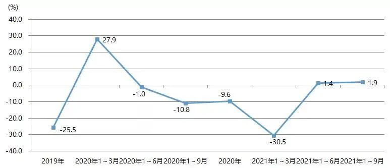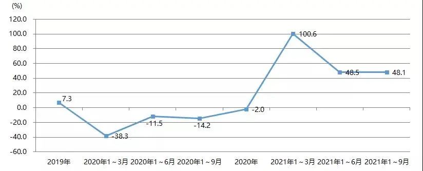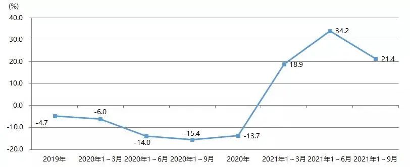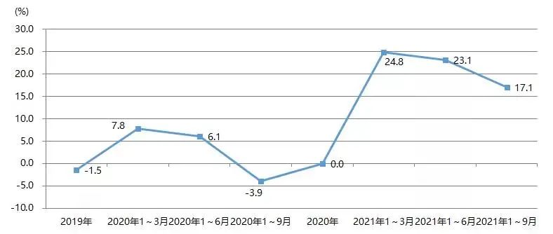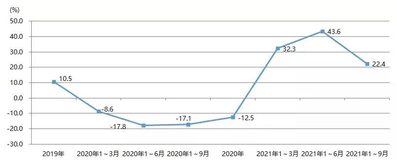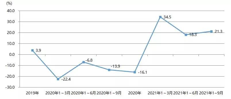 2021年1~9月,我國印刷裝備及器材出口額為28.07億美元,與2020年同期的22.93億美元相比增長22.4%,與2019年同期的27.67億美元增長1.4%。圖23為我國印刷裝備及器材出口額增長率。