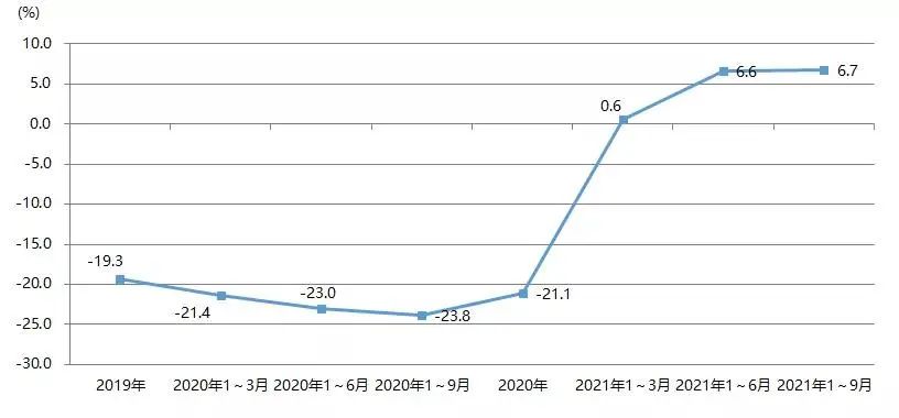 2021年1~9月,我國印前設備進口額也實現了不錯的成績,同比增長21.3%,與2019年同期相比增長4.5%,如圖7所示。