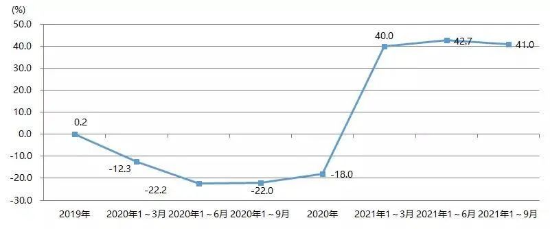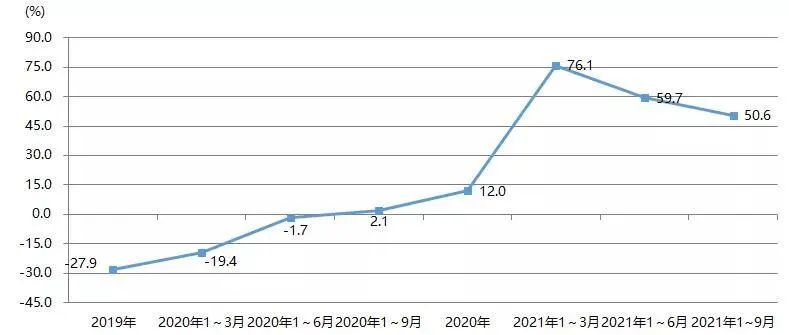2021年1~9月,壓印箔進口額實現了48.1%的增長,與2019年同期相比增長27.0%,如圖10所示;