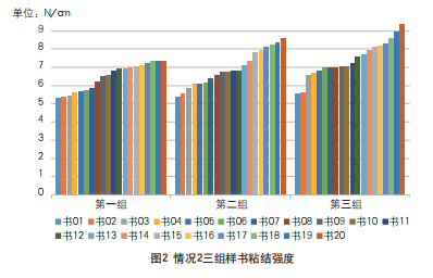 經(jīng)計(jì)算可得,第一組20本樣書的平均粘結(jié)強(qiáng)度為6.5N/cm,第二組為6.9N/cm,第三組為7.4N/cm,如圖2所示。由此可見,第一組和第二組20本樣書的平均粘結(jié)強(qiáng)度都小于第三組,也就是說,第一組和第二組的開槽距離過大或過小。