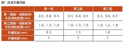 第一種情況,固定上膠輪和書芯間的距離,固定開槽間距,改變開槽深度,如表1所示。