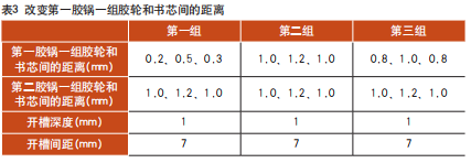 第三種情況,在第一、二種情況最佳數(shù)據(jù)的基礎(chǔ)上,固定開槽深度和開槽間距,改變第一膠鍋一組膠輪(上膠輪、上膠輪、刮膠輪)和書芯間的距離,如表3所示。