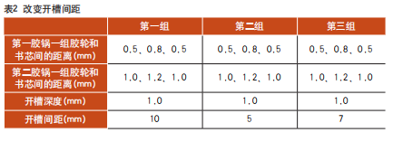 第二種情況,固定上膠輪和書芯間的距離,在第一種情況最佳數(shù)據(jù)的基礎(chǔ)上固定開槽深度,改變開槽間距,如表2所示。