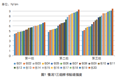 經(jīng)計(jì)算可得,第一組20本樣書的平均粘結(jié)強(qiáng)度為8.4N/cm,第二組為4.2N/cm ,第三組為4.6N/cm,如圖3所示。由此可見,第一組第一膠鍋一組膠輪和書芯間的距離最小,樣書的粘結(jié)強(qiáng)度最高。