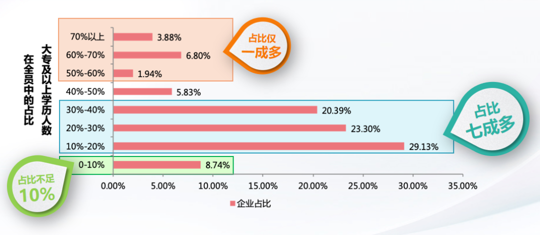 具體來看,大專及以上學(xué)歷人數(shù)在全員中的占比,七成多樣本企業(yè)集中在10%-40%區(qū)間。而占比超過50%的企業(yè),僅占百余家樣本企業(yè)的一成多。尚有8.74%的樣本企業(yè),大專及以上學(xué)歷人數(shù)在企業(yè)中的占比不足10%。
