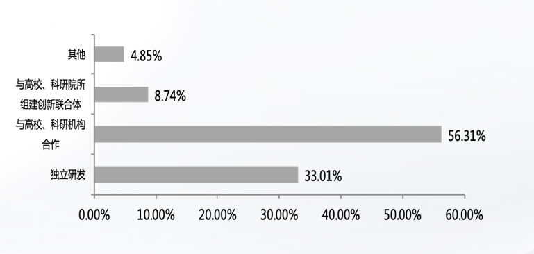 本次調(diào)查中,完全獨(dú)立研發(fā)的樣本企業(yè)占比為33.01%;與高校、科研機(jī)構(gòu)合作的企業(yè)占比為56.31%;更有8.74%的企業(yè)通過與高校、科研院所組建創(chuàng)新聯(lián)合體,緊密合作關(guān)系;同時(shí),還有4.85%的企業(yè),采用了其他合作創(chuàng)新形式,如與設(shè)備廠商聯(lián)合研發(fā)、與終端用戶的技術(shù)中心聯(lián)合研發(fā)并組建創(chuàng)新聯(lián)合體等。