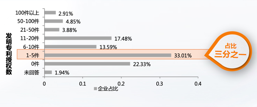 如果以企業(yè)為計(jì)算單位,本次調(diào)查中,樣本企業(yè)平均擁有的發(fā)明專利授權(quán)量為13.1件。未回答企業(yè),占比1.94%;無發(fā)明專利的企業(yè),占比22.33%。發(fā)明專利授權(quán)數(shù)為1-5件的企業(yè),占比三分之一。發(fā)明專利授權(quán)數(shù)為6-10、11-20件的企業(yè)占比又占3成。而發(fā)明專利授權(quán)數(shù)多于20件的企業(yè),占比剛過一成。其中發(fā)明專利授權(quán)數(shù)超過100件的企業(yè),占比2.91%,我們可以斷定這些企業(yè)具備持續(xù)創(chuàng)新的動能和持續(xù)發(fā)展的后勁。