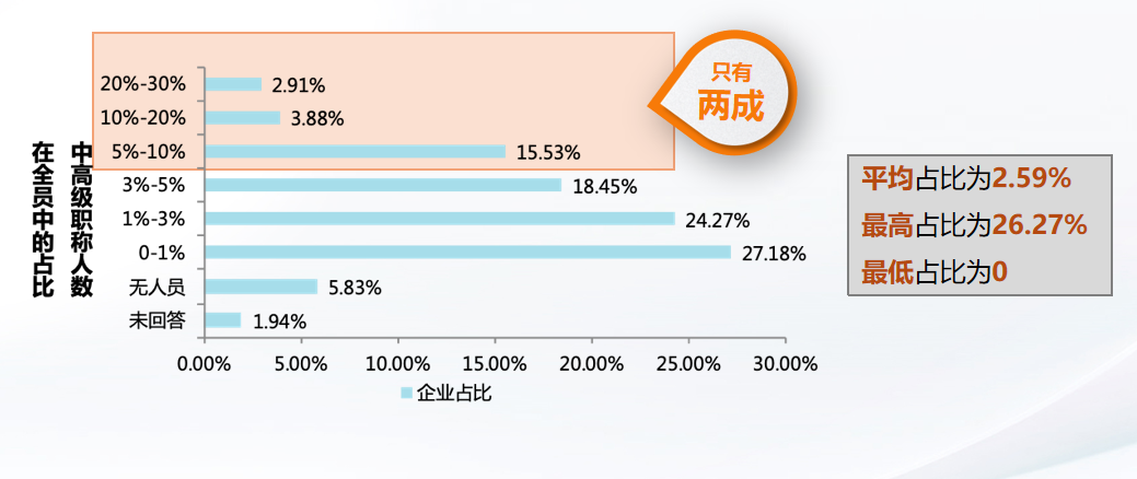 在相當(dāng)多樣本企業(yè)中,中高級職稱人員屈指可數(shù),占比超過5%的企業(yè),只有兩成。