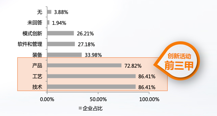 本次調(diào)查中,創(chuàng)新活動分為技術(shù)、工藝、產(chǎn)品、裝備、軟件和管理、模式創(chuàng)新等項(xiàng)。