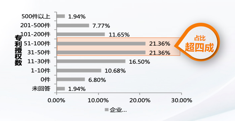 具體來看,樣本企業(yè)中,未回答企業(yè)占比1.94%,無專利授權(quán)企業(yè)占比6.80%,兩者相加不到10%,表明樣本企業(yè)中有不到1成企業(yè)仍無專利建設(shè)。擁有專利授權(quán)數(shù)量31-50\51-100件的企業(yè)占比超過四成。同時(shí),還有超過兩成企業(yè),其擁有的專利授權(quán)數(shù)量超過100件,更有將近2%的企業(yè),擁有專利授權(quán)數(shù)量超過500件,成果斐然。