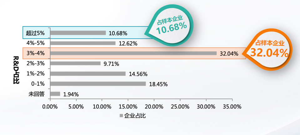本次調(diào)查中,百余家樣本企業(yè)的平均R&D占比為2.8%。其中,R&D占比最高的企業(yè)為10.9%。