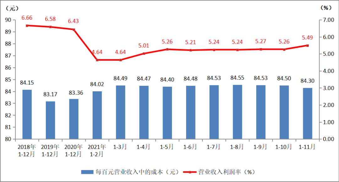 2021年1-11月,印刷業(yè)每百元營業(yè)收入中的成本為84.30元,相比上月略有下降。此項指標高于全部工業(yè)83.72元的平均水平。
