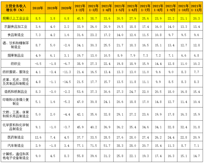 表中顯示,2021年1-11月全部工業(yè)主營業(yè)務(wù)收入平均增長為20.3%。