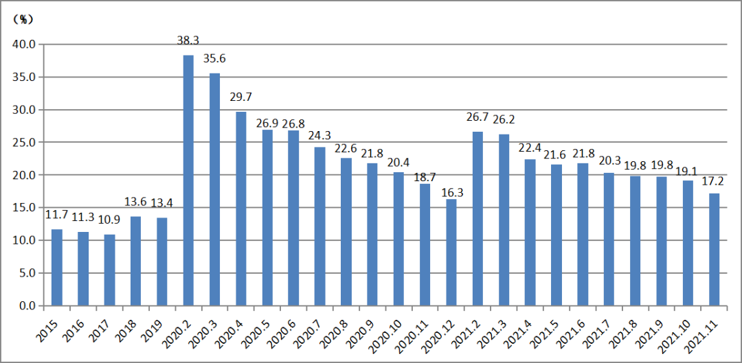 2021年1-11月,全部工業(yè)(規(guī)模以上企業(yè))工業(yè)增加值同比增長10.1%,兩年平均增長6.1%。從當(dāng)月增速來看,11月份,規(guī)模以上工業(yè)增加值同比增長3.8%,比上月加快0.3個百分點,兩年平均增長5.4%,比上月加快0.2個百分點,增速延續(xù)了上月的回升態(tài)勢。41個大類行業(yè)中有29個行業(yè)增加值保持同比增長。