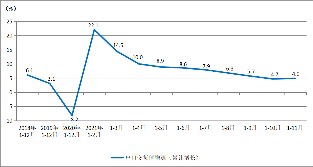 2021年1-11月,印刷業(yè)出口交貨值同比增長4.9%。與全部工業(yè)12.9%的出口增長率相比,印刷業(yè)的出口增長恢復(fù)較慢。不過,11月份當(dāng)月印刷業(yè)出口交貨值同比上年增長7.6%,相比上月的0%,有比較明顯的增幅,也由此拉動1-11月累計增速有所提升。