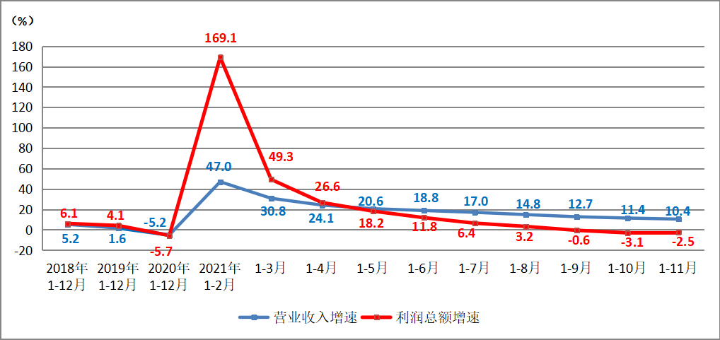 近日,國家統(tǒng)計局披露了2021年1-11月工業(yè)企業(yè)經(jīng)濟效益狀況。11月份,面對復(fù)雜嚴峻國際環(huán)境和國內(nèi)疫情散發(fā)多發(fā)等多重挑戰(zhàn),工業(yè)生產(chǎn)繼續(xù)保持恢復(fù)態(tài)勢,多項指標繼續(xù)小幅回升。