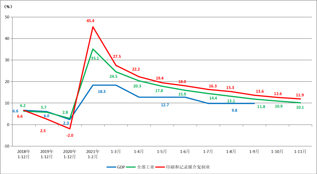 2021年1-11月,“印刷和記錄媒介復(fù)制業(yè)”工業(yè)增加值同比增長11.9%,高于全部工業(yè)10.1%的平均水平。從11月份當(dāng)月增速來看,印刷業(yè)的工業(yè)增加值增速為6.7%,相比上月的4.9%,提升了1.8個百分點,增幅較明顯。