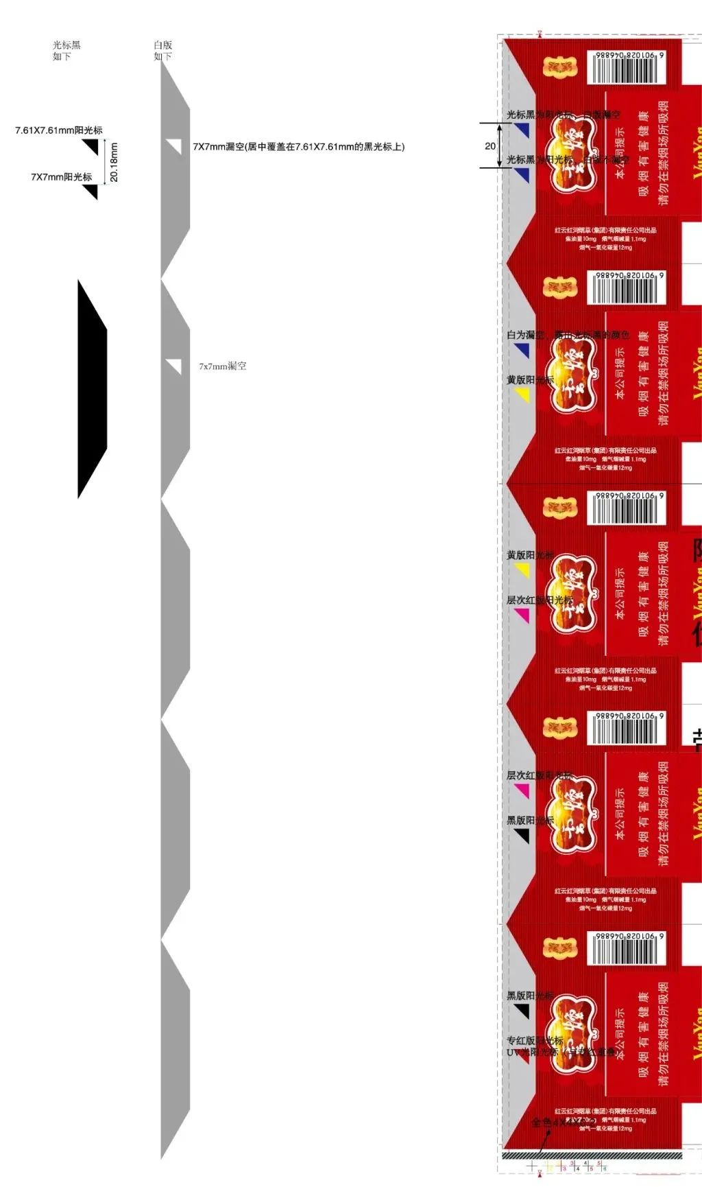 “云煙(紫)”硬包產(chǎn)品第一色為白色,白版光標(biāo)的設(shè)置如圖2 b所示。第一個“燕尾”處的兩個光標(biāo)為7mm×7mm,第一個光標(biāo)鏤空,居中覆蓋在7.61mm×7.61mm的黑色光標(biāo)上,第二個光標(biāo)不鏤空,覆蓋在第二個黑色光標(biāo)上,露出灰黑色的光標(biāo),兩個光標(biāo)的間距為20mm。第二個“燕尾”處的光標(biāo)為7mm×7mm鏤空,露出一個7mm×7mm的黑色光標(biāo),其余“燕尾”處印刷實(shí)地色條即可。然后將余下色組的7mm×7mm光標(biāo)印刷在白版的色條上即可,如圖2c所示。這樣,一組套印光標(biāo)就設(shè)置好了。經(jīng)過上機(jī)批量生產(chǎn)驗(yàn)證,套印穩(wěn)定,生產(chǎn)正常。