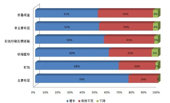 最近NAPCO Research對品牌所有者的一項調查顯示,包裝是一個增長機會。超過一半的參與調查的品牌品牌商表示標簽、折疊紙盒、瓦楞包裝和軟包裝的使用增加(圖 1)。雖然這項調查是在新冠疫情大流行之前進行的,但NAPCO Research在2020年對印刷供應商調查跟蹤,顯示包裝一直是一種彈性應用。