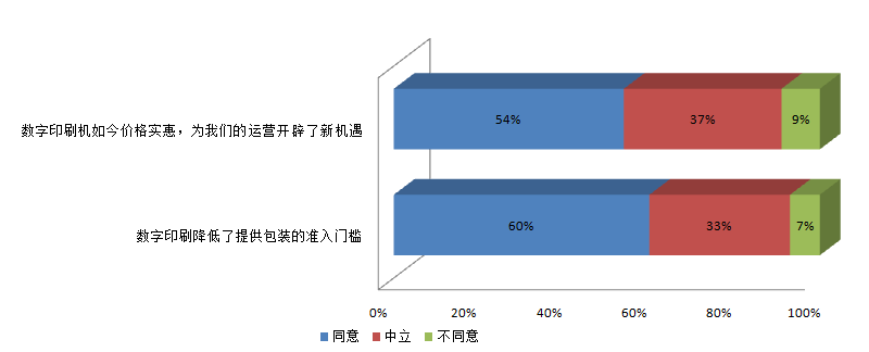 今天,幾乎每個印刷廠都有一種數字印刷設備,成本從高達上千萬的數字印刷機到千元的桌面打印設備不等。以往,進入或擴展包裝市場的一個典型障礙是投資成本。現在,超過一半的受訪者認為,數字包裝印刷設備更實惠,并為其運營提供了新的機會(圖 2)。更重要的是,92% 的人表示,已經用在數字印刷機上打印標簽和包裝。