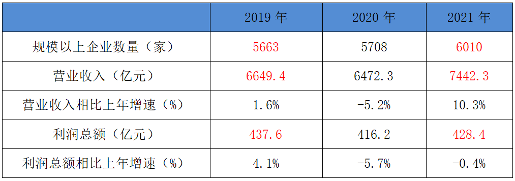 再看利潤總額。2019年5600多家企業,利潤總額438億元;到2021年多了300多家企業,利潤總額428億元。兩年對比,規上企業數量增加,利潤總額減少,以規上企業每家的平均利潤計算,兩年對比降幅為7.76%。