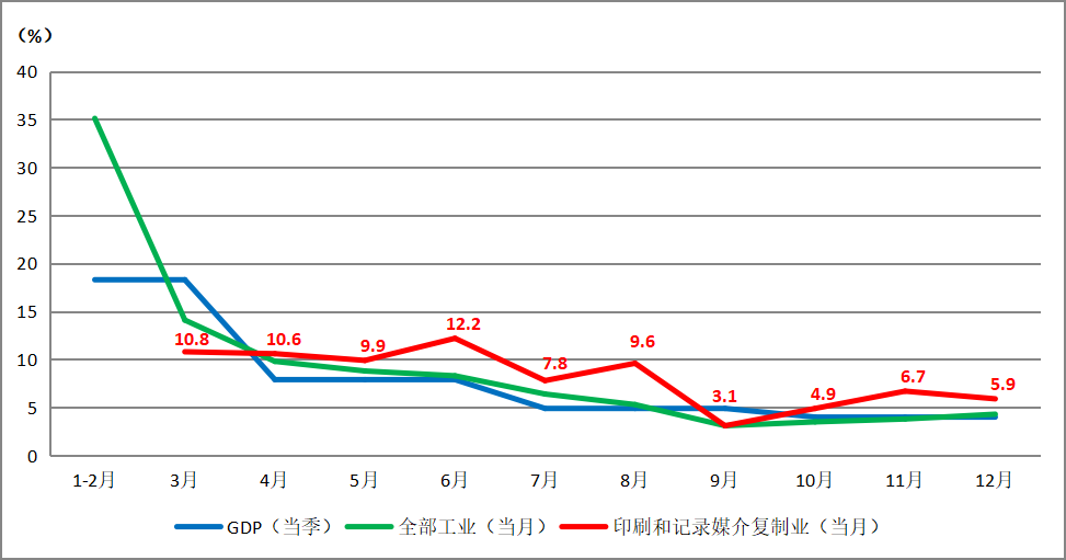 為了更清晰了解印刷企業在2021年的發展態勢,圖2顯示了2021年GDP各季度、全部工業與印刷業各月的增加值速度。